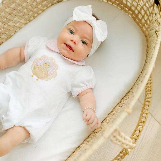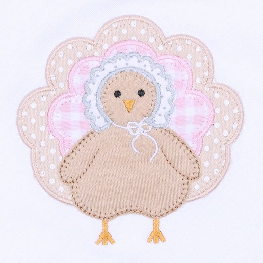 Magnolia Baby Pilgrim Pals Applique Collared Short Sleeve Bubble - Pink Celebrate Thanksgiving in adorable style with our Pilgrim Pals Applique Collared Short Sleeve Bubble! Inspired by the Thanksgiving holiday and the imagery of Pilgrims and the fall harvest, this charming one-piece features a delightful turkey appliqué on luxurious Pima Cotton, perfect for your little girl.